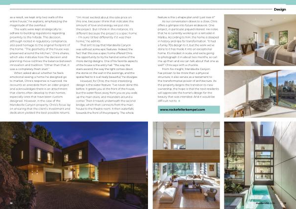 When asked about whether he feels emotional seeing a home he designed go to market , Chris ’ s response is nuanced . He recounts an anecdote from an older project and acknowledges there is an attachment that clients often develop to their homes , especially ones that have been custom designed . However , in the case of the Mandeville Canyon property , Chris ’ s focus lay on ensuring that the client ’ s investment and dedication yielded the best possible returns .