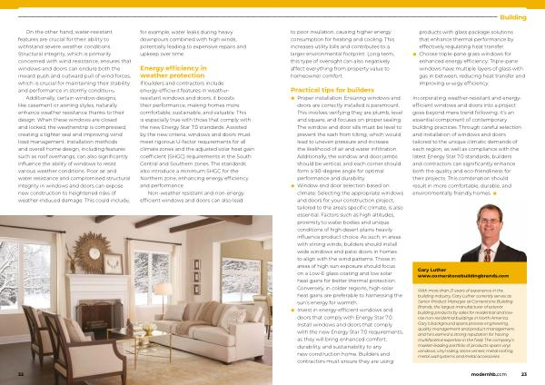 Incorporating weather-resistant and energyefficient windows and doors into a project goes beyond mere trend following , it ’ s an essential component of contemporary building practices . Through careful selection and installation of windows and doors tailored to the unique climatic demands of each region , as well as compliance with the latest Energy Star 7.0 standards , builders and contractors can significantly enhance both the quality and eco-friendliness for their projects . This combination should result in more comfortable , durable , and environmentally friendly homes . ■