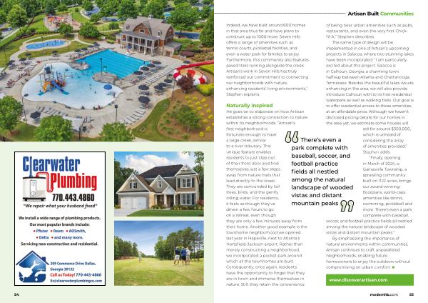 The same type of design will be implemented in one of Artisan ’ s upcoming projects in Salacoa , where two stunning lakes have been incorporated . “ I am particularly excited about this project . Salacoa is in Calhoun , Georgia , a charming town halfway between Atlanta and Chattanooga , Tennessee . Besides the beautiful lakes we are enhancing in the area , we will also provide introduce Calhoun with to its first residential waterpark as well as walking trails . Our goal is to offer residential access to these amenities at an affordable price . Although we haven ’ t disclosed pricing details for our homes in the area yet , we estimate some houses will sell for around $ 300,000 , which is unheard of considering the array of amenities provided ,” Stephen adds .