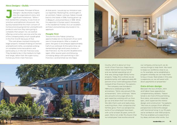 John Schrader , Principal of Nova Designs + Builds shares insights into the organization ’ s story and significant milestones . “ When I first started the company , it was more of a kitchen and bathroom showroom . We quickly realized that the main concern of homeowners buying kitchen and bathroom products was how they were going to complete their project . So , we started offering construction services and the size of the company pretty much quadrupled in the first month because of that .