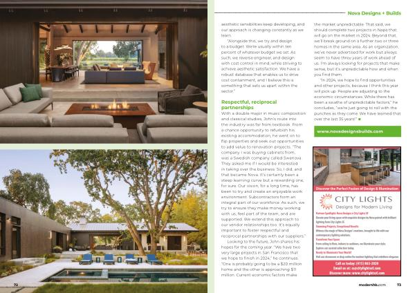 Looking to the future , John shares his hopes for the coming year . “ We have two very large projects in San Francisco that we hope to finish in 2024 ,” he continues . “ One is probably going to be a $ 20 million home and the other is approaching $ 11 million . Current economic factors make the market unpredictable . That said , we should complete two projects in Napa that will go on the market in 2024 . Beyond that , we ’ ll break ground on a further two or three homes in the same area . As an organization , we ’ ve never advertised for work but always seem to have three years of work ahead of us . I ’ m always looking for projects that make sense , but it ’ s unpredictable how and when you find them .