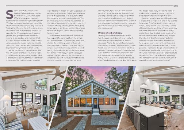 Creating custom homes means CRx has had the opportunity to work on a variety of innovative and unusual projects . As Dion discusses : “ We ’ ve done a lot of cool projects over the last two years . We finished an oceanfront house on Fenwick Island recently . It ’ s a beautiful property , and quite unique , with Key West and New Orleans influences . We have also worked on two very different modern family homes . One was a single-story house , which was built around its outdoor living space .