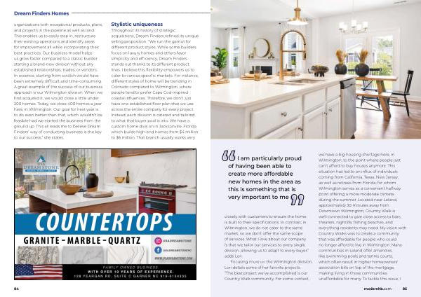 Focusing more on the Wilmington division , Lori details some of her favorite projects . “ The best project we ’ ve accomplished is our Country Walk community . For some context , we have a big housing shortage here , in Wilmington , to the point where people just can ’ t afford to buy houses anymore . This situation has led to an influx of individuals coming from California , Texas , New Jersey , as well as retirees from Florida , for whom Wilmington serves as a convenient halfway point offering a more moderate climate during the summer . Located near Leland , approximately 30 minutes away from Downtown Wilmington , Country Walk is well-connected to give close access to bars , theaters , nightlife , fishing beaches , and everything residents may need . My vision with Country Walks was to create a community that was affordable for people who could no longer afford to live in Wilmington . Many communities in Leland offer amenities like swimming pools and tennis courts , which often result in higher homeowners ’ association bills on top of the mortgage , making living in those communities unaffordable for many . To tackle this issue , I