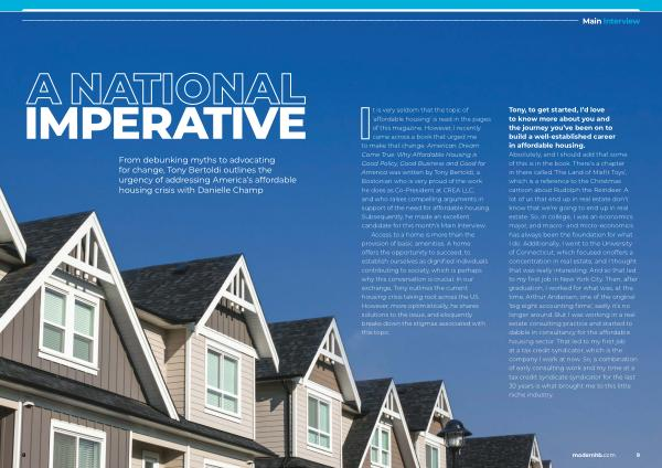 Tony , to get started , I ’ d love to know more about you and the journey you ’ ve been on to build a well-established career in affordable housing . Absolutely , and I should add that some of this is in the book . There ’ s a chapter in there called ‘ The Land of Misfit Toys ’, which is a reference to the Christmas cartoon about Rudolph the Reindeer . A lot of us that end up in real estate don ’ t know that we ’ re going to end up in real estate . So , in college , I was an economics major , and macro- and micro-economics has always been the foundation for what I do . Additionally , I went to the University of Connecticut , which focused onoffers a concentration in real estate , and I thought that was really interesting . And so that led to my first job in New York City . Then , after graduation , I worked for what was , at the time , Arthur Andersen , one of the original ‘ big eight accounting firms ’, sadly it ’ s no longer around . But I was working in a real estate consulting practice and started to dabble in consultancy for the affordable housing sector . That led to my first job at a tax credit syndicator , which is the company I work at now . So , a combination of early consulting work and my time at a tax credit syndicate syndicator for the last 30 years is what brought me to this little niche industry . modernhb . com 9