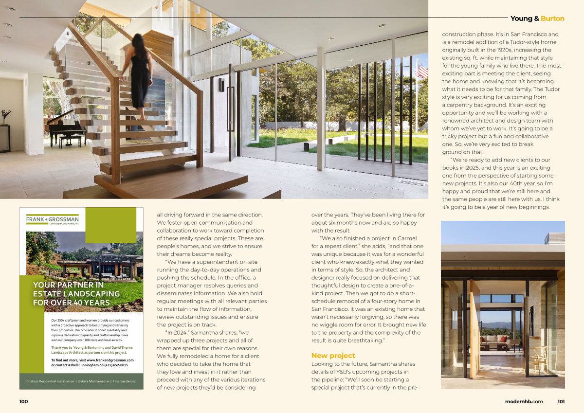 “ We also finished a project in Carmel for a repeat client,” she adds,“ and that one was unique because it was for a wonderful client who knew exactly what they wanted in terms of style. So, the architect and designer really focused on delivering that thoughtful design to create a one-of-akind project. Then we got to do a shortschedule remodel of a four-story home in San Francisco. It was an existing home that wasn’ t necessarily forgiving, so there was no wiggle room for error. It brought new life to the property and the complexity of the result is quite breathtaking.”
