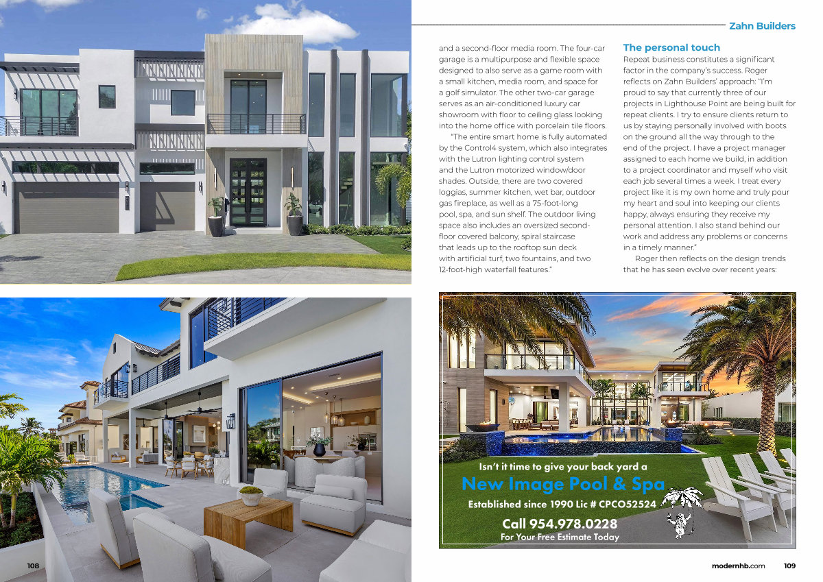 Repeat business constitutes a significant factor in the company’ s success. Roger reflects on Zahn Builders’ approach:“ I’ m proud to say that currently three of our projects in Lighthouse Point are being built for repeat clients. I try to ensure clients return to us by staying personally involved with boots on the ground all the way through to the end of the project. I have a project manager assigned to each home we build, in addition to a project coordinator and myself who visit each job several times a week. I treat every project like it is my own home and truly pour my heart and soul into keeping our clients happy, always ensuring they receive my personal attention. I also stand behind our work and address any problems or concerns in a timely manner.”