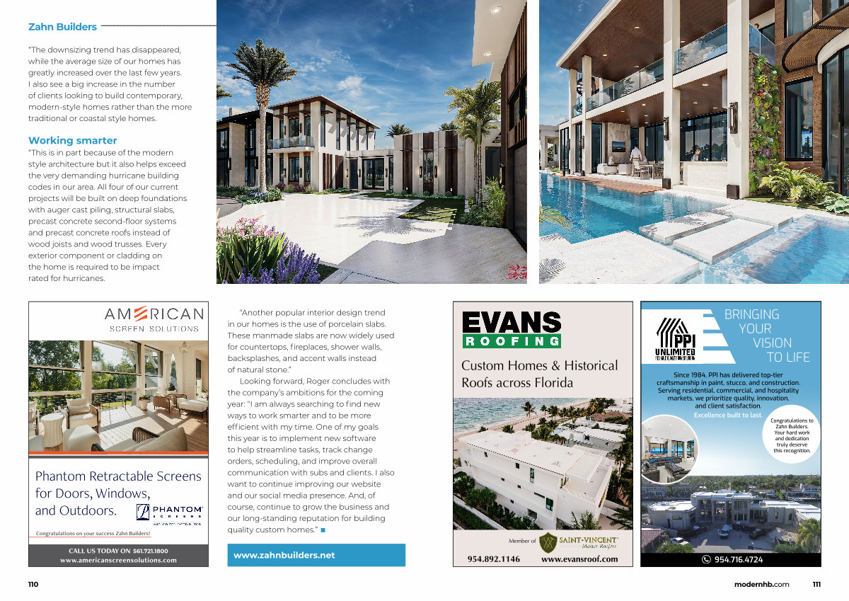 Looking forward, Roger concludes with the company’ s ambitions for the coming year:“ I am always searching to find new ways to work smarter and to be more efficient with my time. One of my goals this year is to implement new software to help streamline tasks, track change orders, scheduling, and improve overall communication with subs and clients. I also want to continue improving our website and our social media presence. And, of course, continue to grow the business and our long-standing reputation for building quality custom homes.” ■