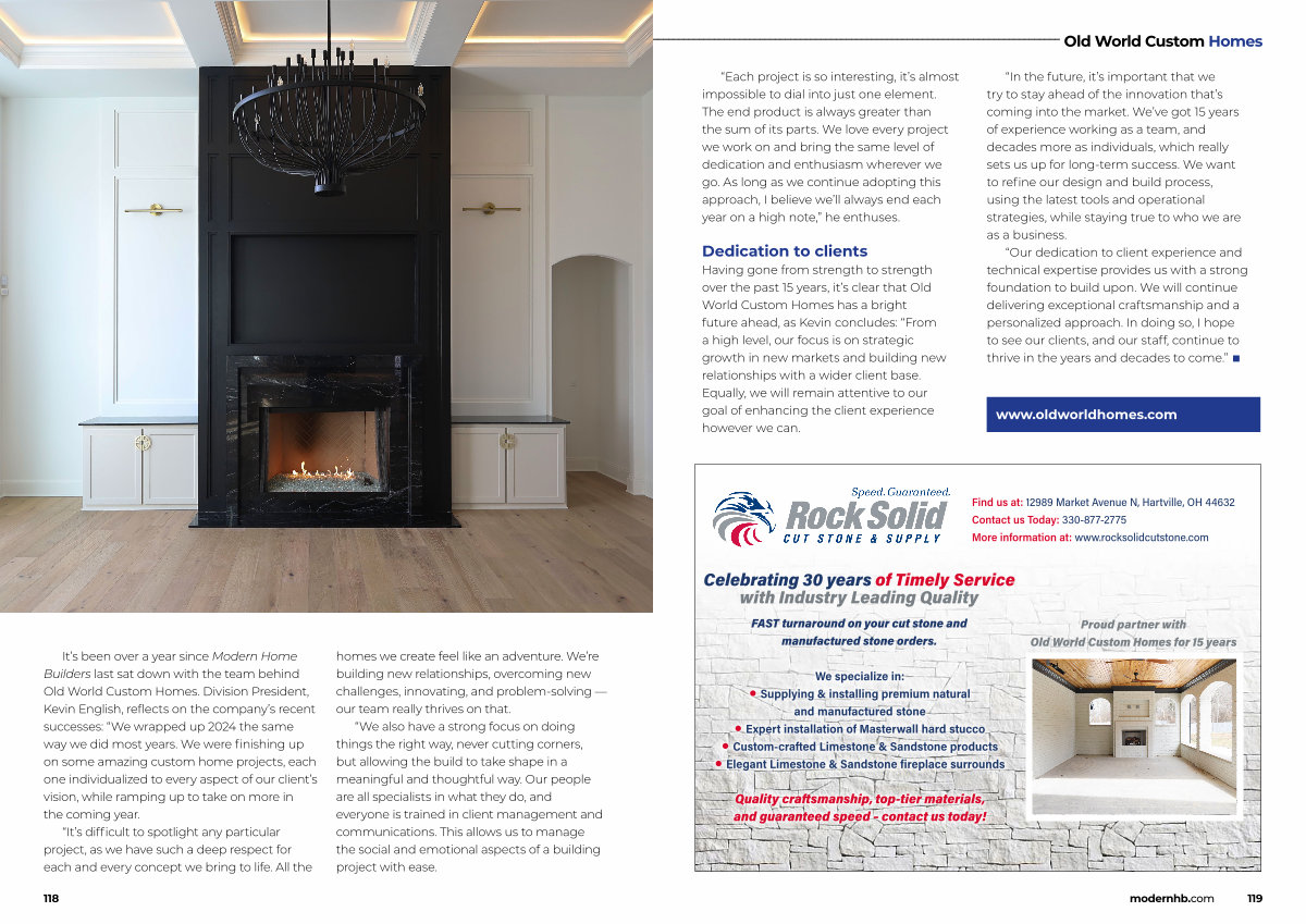 It’ s been over a year since Modern Home Builders last sat down with the team behind Old World Custom Homes. Division President, Kevin English, reflects on the company’ s recent successes:“ We wrapped up 2024 the same way we did most years. We were finishing up on some amazing custom home projects, each one individualized to every aspect of our client’ s vision, while ramping up to take on more in the coming year.