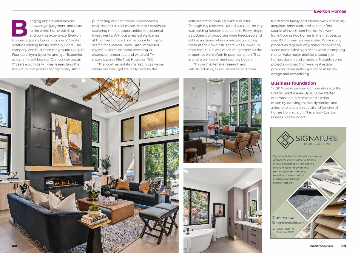 Bringing unparalleled design knowledge, judgment, and taste to the entire home building and buying experience, Everton Homes is quickly becoming one of Greater Seattle’ s leading luxury home builders. The company was built from the ground up by Co- Founders, Iryna Sysenko and Igor Tsapenko, as Iryna herself begins:“ Our journey began 17 years ago. Initially, I was researching the market to find a home for my family. After purchasing our first house, I developed a deep interest in real estate, and so I continued exploring market opportunities for potential investments. Without a real estate license at the time, I utilized online home listings to search for available units. I also immersed myself in literature about investing in distressed properties, and watched TV shows such as Flip That House on TLC.