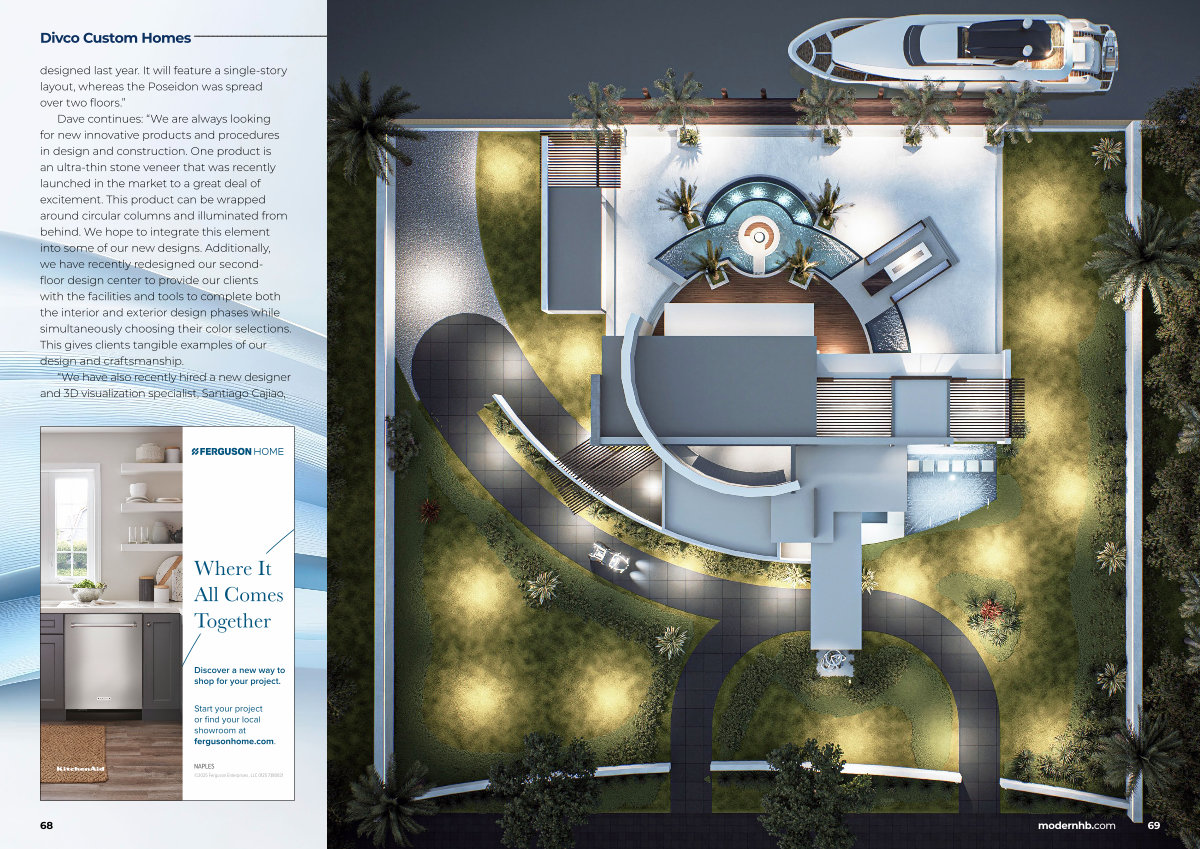 Dave continues:“ We are always looking for new innovative products and procedures in design and construction. One product is an ultra-thin stone veneer that was recently launched in the market to a great deal of excitement. This product can be wrapped around circular columns and illuminated from behind. We hope to integrate this element into some of our new designs. Additionally, we have recently redesigned our secondfloor design center to provide our clients with the facilities and tools to complete both the interior and exterior design phases while simultaneously choosing their color selections. This gives clients tangible examples of our design and craftsmanship.