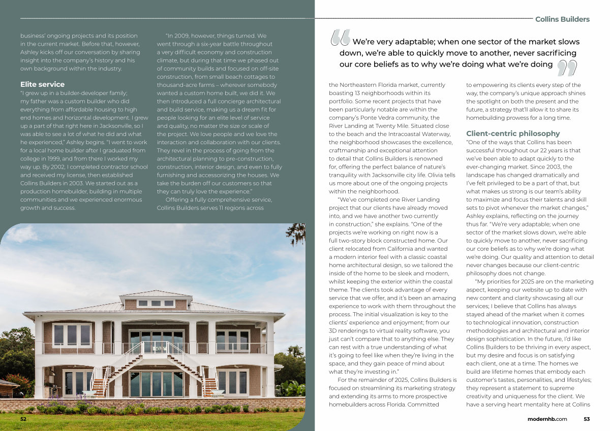 “ I grew up in a builder-developer family; my father was a custom builder who did everything from affordable housing to high end homes and horizontal development. I grew up a part of that right here in Jacksonville, so I was able to see a lot of what he did and what he experienced,” Ashley begins.“ I went to work for a local home builder after I graduated from college in 1999, and from there I worked my way up. By 2002, I completed contractor school and received my license, then established Collins Builders in 2003. We started out as a production homebuilder, building in multiple communities and we experienced enormous growth and success.