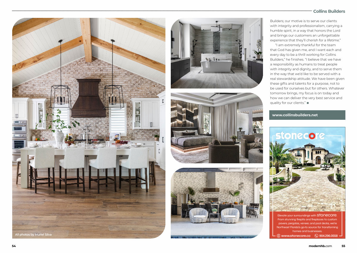 Builders; our motive is to serve our clients with integrity and professionalism, carrying a humble spirit, in a way that honors the Lord and brings our customers an unforgettable experience that they’ ll cherish for a lifetime.”“ I am extremely thankful for the team that God has given me, and I want each and every day to be a thrill working for Collins Builders,” he finishes.“ I believe that we have a responsibility as humans to treat people with integrity and dignity, and to serve them in the way that we’ d like to be served with a real stewardship attitude. We have been given these gifts and talents for a purpose, not to be used for ourselves but for others. Whatever tomorrow brings, my focus is on today and how we can deliver the very best service and quality for our clients.” ■