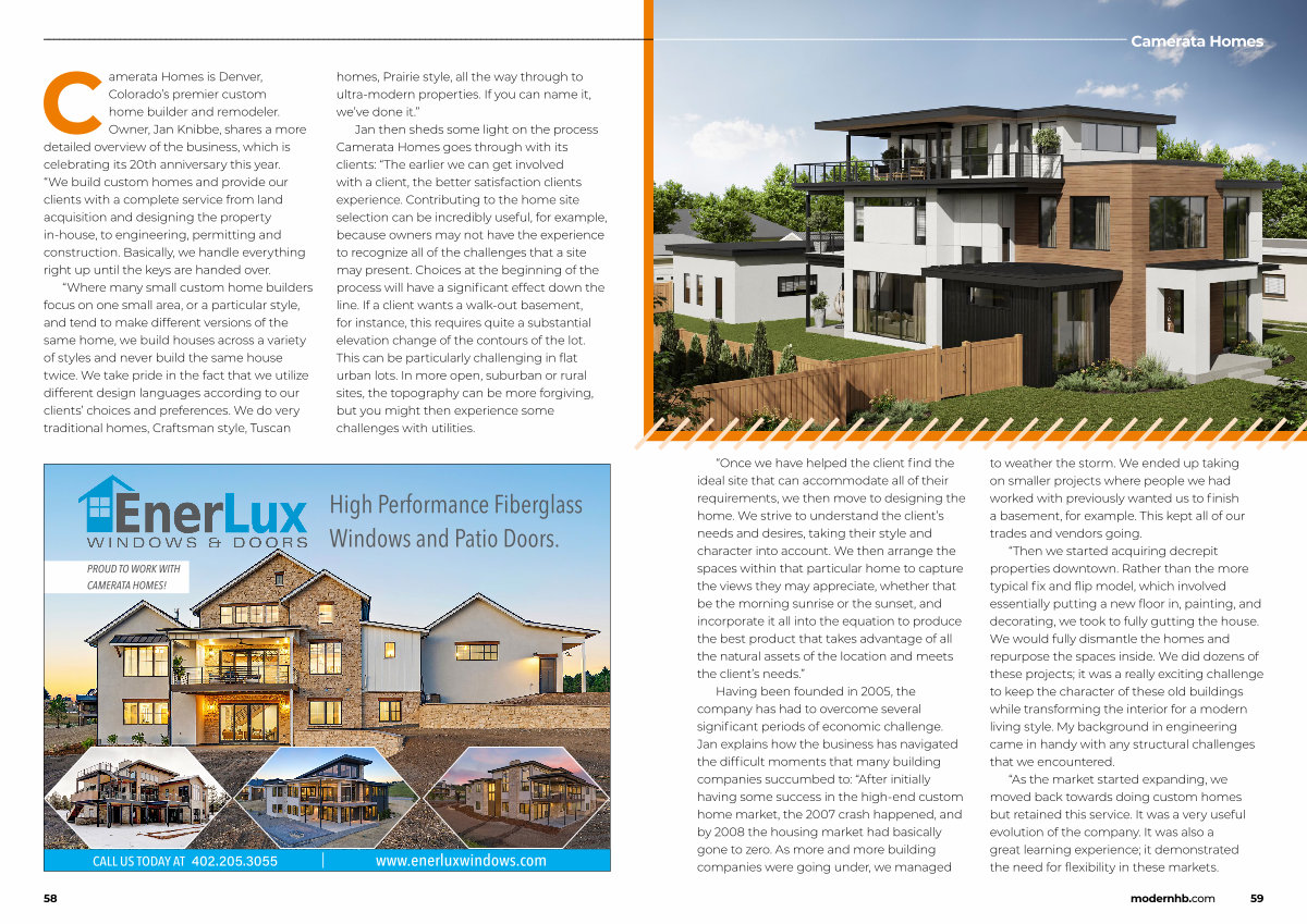Camerata Homes is Denver, Colorado’ s premier custom home builder and remodeler. Owner, Jan Knibbe, shares a more detailed overview of the business, which is celebrating its 20th anniversary this year.“ We build custom homes and provide our clients with a complete service from land acquisition and designing the property in-house, to engineering, permitting and construction. Basically, we handle everything right up until the keys are handed over.