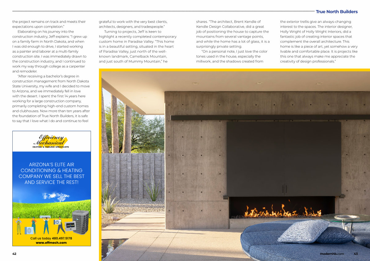 Turning to projects, Jeff is keen to highlight a recently completed contemporary custom home in Paradise Valley.“ This home is in a beautiful setting, situated in the heart of Paradise Valley, just north of the wellknown landmark, Camelback Mountain, and just south of Mummy Mountain,” he