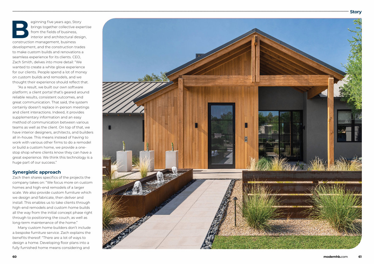 Beginning five years ago, Story brings together collective expertise from the fields of business, interior and architectural design, construction management, business development, and the construction trades to make custom builds and renovations a seamless experience for its clients. CEO, Zach Smith, delves into more detail:“ We wanted to create a white glove experience for our clients. People spend a lot of money on custom builds and remodels, and we thought their experience should reflect that.“ As a result, we built our own software platform; a client portal that’ s geared around reliable results, consistent outcomes, and great communication. That said, the system certainly doesn’ t replace in-person meetings and client interactions. Indeed, it provides supplementary information and an easy method of communication between various teams as well as the client. On top of that, we have interior designers, architects, and builders all in-house. This means instead of having to work with various other firms to do a remodel or build a custom home, we provide a onestop shop where clients know they can have a great experience. We think this technology is a huge part of our success.”