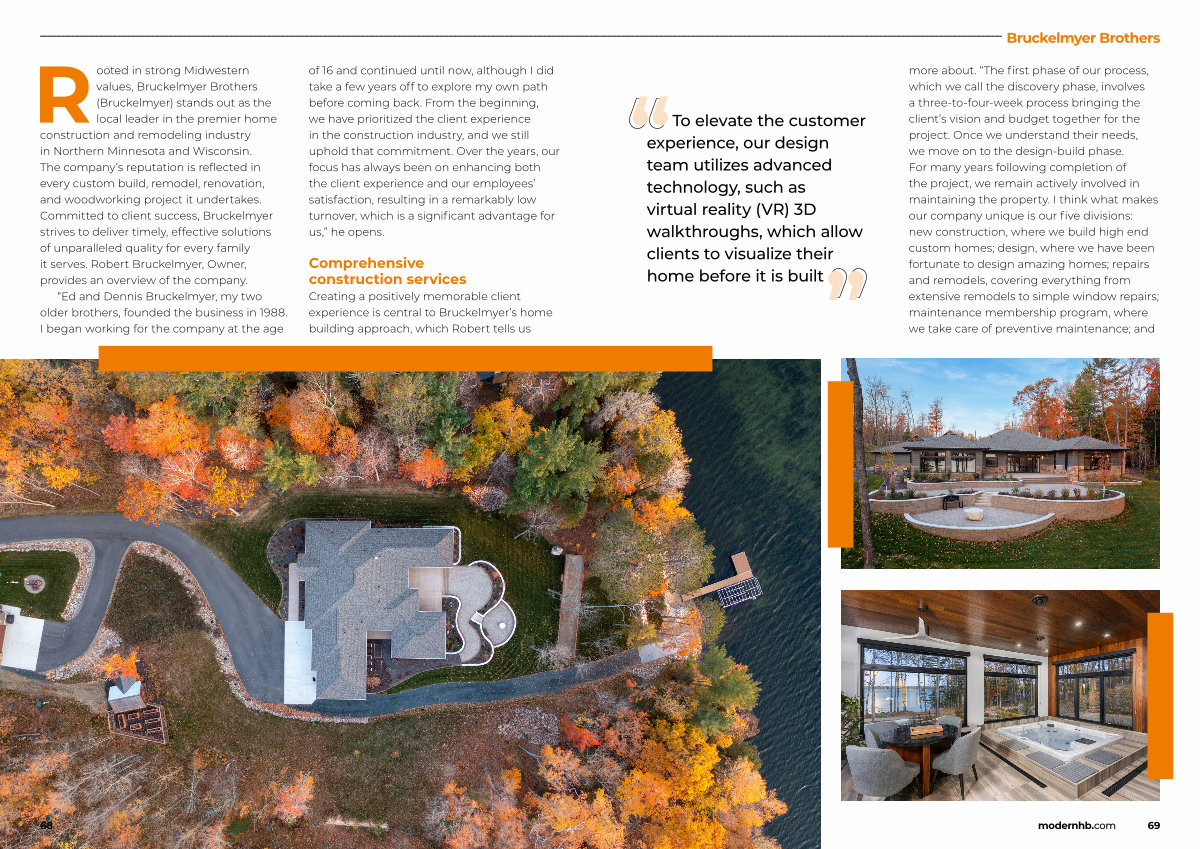 Rooted in strong Midwestern values, Bruckelmyer Brothers( Bruckelmyer) stands out as the local leader in the premier home construction and remodeling industry in Northern Minnesota and Wisconsin. The company’ s reputation is reflected in every custom build, remodel, renovation, and woodworking project it undertakes. Committed to client success, Bruckelmyer strives to deliver timely, effective solutions of unparalleled quality for every family it serves. Robert Bruckelmyer, Owner, provides an overview of the company.