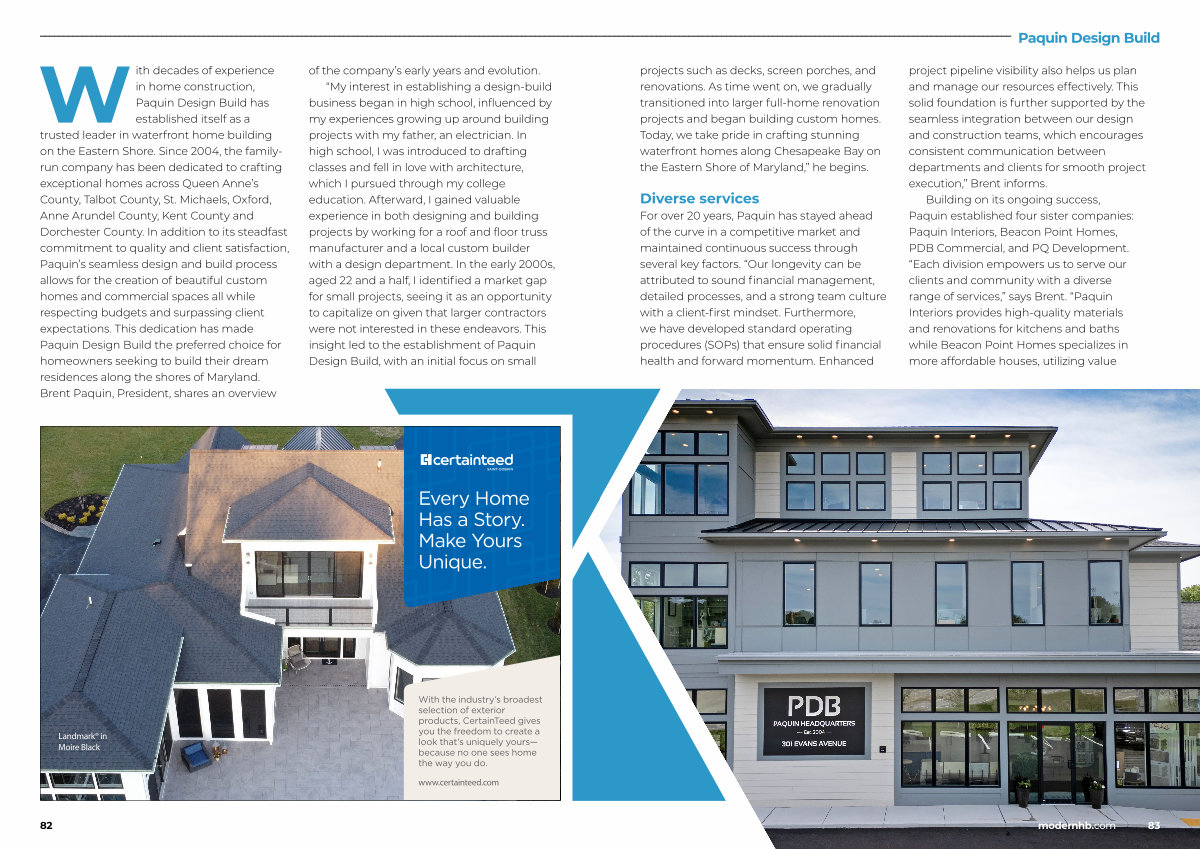 With decades of experience in home construction, Paquin Design Build has established itself as a trusted leader in waterfront home building on the Eastern Shore. Since 2004, the familyrun company has been dedicated to crafting exceptional homes across Queen Anne’ s County, Talbot County, St. Michaels, Oxford, Anne Arundel County, Kent County and Dorchester County. In addition to its steadfast commitment to quality and client satisfaction, Paquin’ s seamless design and build process allows for the creation of beautiful custom homes and commercial spaces all while respecting budgets and surpassing client expectations. This dedication has made Paquin Design Build the preferred choice for homeowners seeking to build their dream residences along the shores of Maryland. Brent Paquin, President, shares an overview of the company’ s early years and evolution.