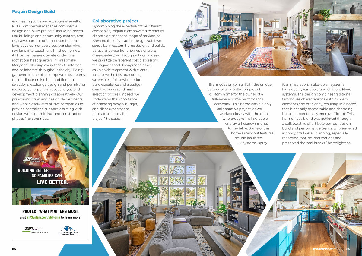 By combining the expertise of five different companies, Paquin is empowered to offer its clientele an enhanced range of services, as Brent explains.“ At Paquin Design Build, we specialize in custom home design and builds, particularly waterfront homes along the Chesapeake Bay. Throughout our process, we prioritize transparent cost discussions for upgrades and downgrades, as well as vision development with clients. To achieve the best outcomes, we ensure a full-service designbuild experience and a budgetsensitive design and finish selection process. Indeed, we understand the importance of balancing design, budget, and client expectations to create a successful project,” he states.