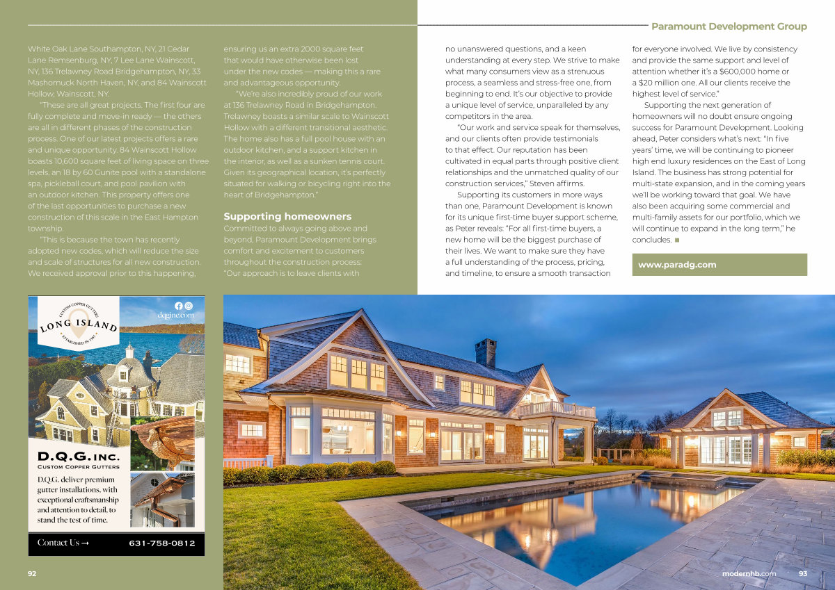 Supporting the next generation of homeowners will no doubt ensure ongoing success for Paramount Development. Looking ahead, Peter considers what’ s next:“ In five years’ time, we will be continuing to pioneer high end luxury residences on the East of Long Island. The business has strong potential for multi-state expansion, and in the coming years we’ ll be working toward that goal. We have also been acquiring some commercial and multi-family assets for our portfolio, which we will continue to expand in the long term,” he concludes. ■