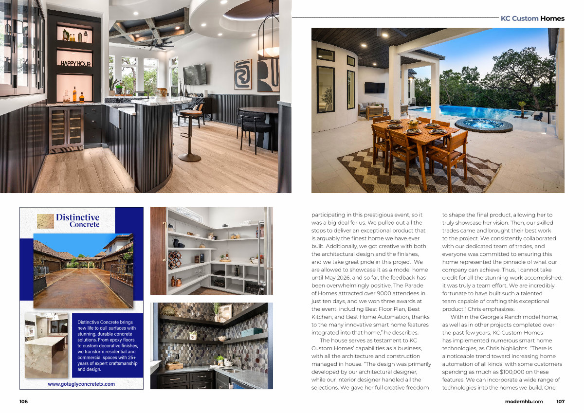 participating in this prestigious event, so it was a big deal for us. We pulled out all the stops to deliver an exceptional product that is arguably the finest home we have ever built. Additionally, we got creative with both the architectural design and the finishes, and we take great pride in this project. We are allowed to showcase it as a model home until May 2026, and so far, the feedback has been overwhelmingly positive. The Parade of Homes attracted over 9000 attendees in just ten days, and we won three awards at the event, including Best Floor Plan, Best Kitchen, and Best Home Automation, thanks to the many innovative smart home features integrated into that home,” he describes.