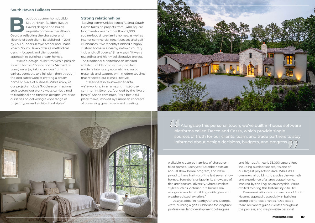Serving communities across Atlanta, South Haven takes on projects from 1,400-squarefoot townhomes to more than 12,000 square-foot single-family homes, as well as interior commercial tenant spaces and golf clubhouses.“ We recently finished a highly custom home in a nearby in-town country club and golf course,” Shane says.“ It was a rewarding and highly collaborative project. The traditional Mediterranean-inspired architecture blended with a‘ primitive modern’ interior style, combining rustic materials and textures with modern touches that reflected our client’ s lifestyle.