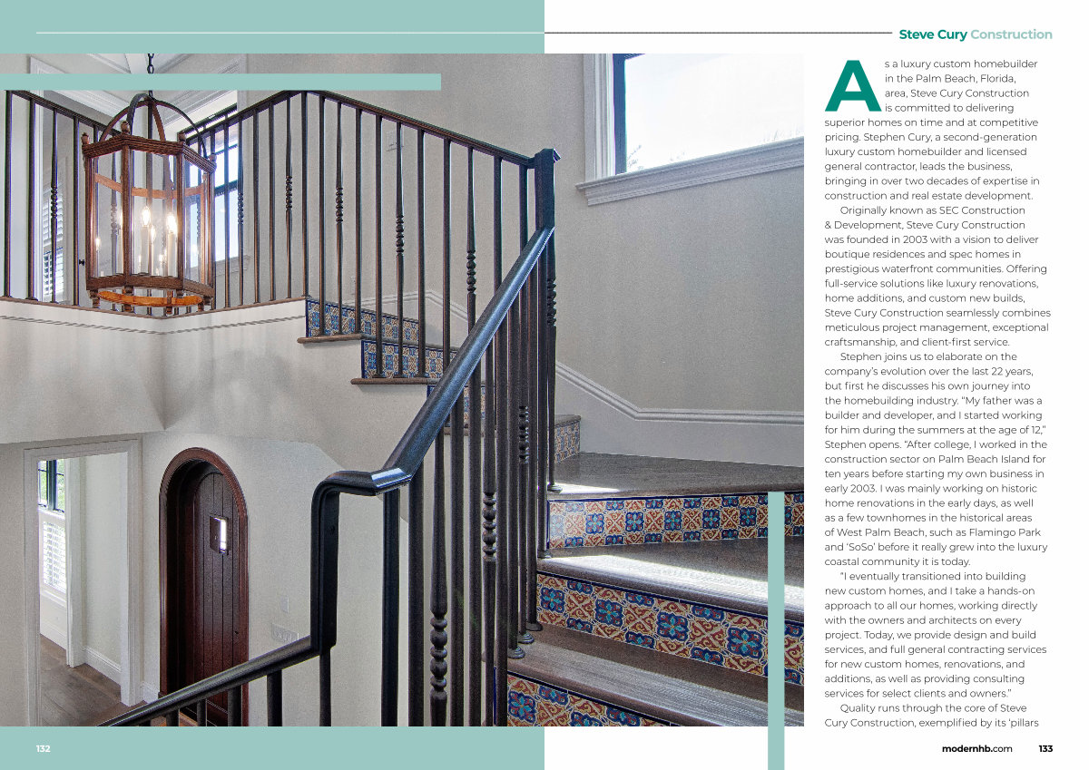 Stephen joins us to elaborate on the company’ s evolution over the last 22 years, but first he discusses his own journey into the homebuilding industry.“ My father was a builder and developer, and I started working for him during the summers at the age of 12,” Stephen opens.“ After college, I worked in the construction sector on Palm Beach Island for ten years before starting my own business in early 2003. I was mainly working on historic home renovations in the early days, as well as a few townhomes in the historical areas of West Palm Beach, such as Flamingo Park and‘ SoSo’ before it really grew into the luxury coastal community it is today.