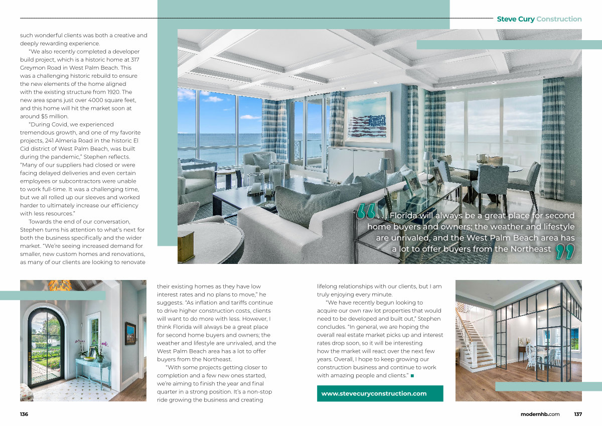 “ During Covid, we experienced tremendous growth, and one of my favorite projects, 241 Almeria Road in the historic El Cid district of West Palm Beach, was built during the pandemic,” Stephen reflects.“ Many of our suppliers had closed or were facing delayed deliveries and even certain employees or subcontractors were unable to work full-time. It was a challenging time, but we all rolled up our sleeves and worked harder to ultimately increase our efficiency with less resources.”