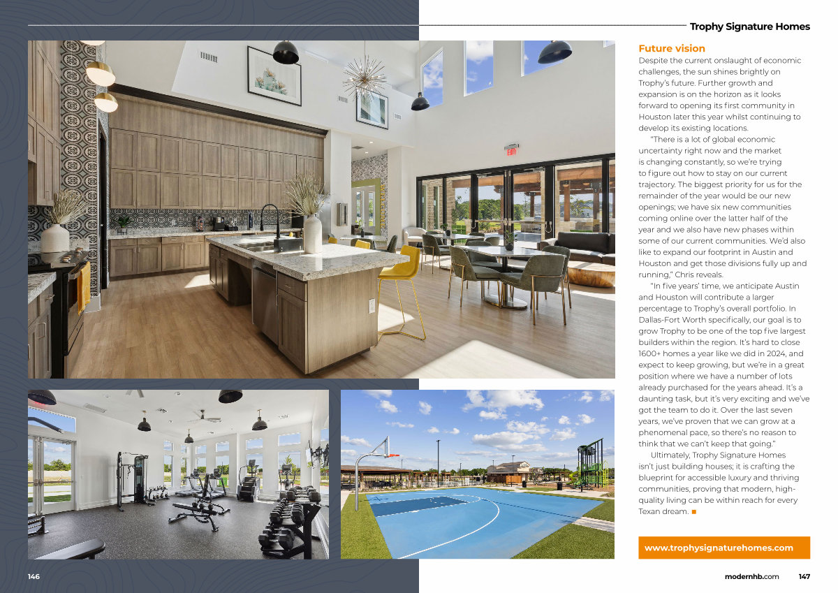 “ In five years’ time, we anticipate Austin and Houston will contribute a larger percentage to Trophy’ s overall portfolio. In Dallas-Fort Worth specifically, our goal is to grow Trophy to be one of the top five largest builders within the region. It’ s hard to close 1600 + homes a year like we did in 2024, and expect to keep growing, but we’ re in a great position where we have a number of lots already purchased for the years ahead. It’ s a daunting task, but it’ s very exciting and we’ ve got the team to do it. Over the last seven years, we’ ve proven that we can grow at a phenomenal pace, so there’ s no reason to think that we can’ t keep that going.”