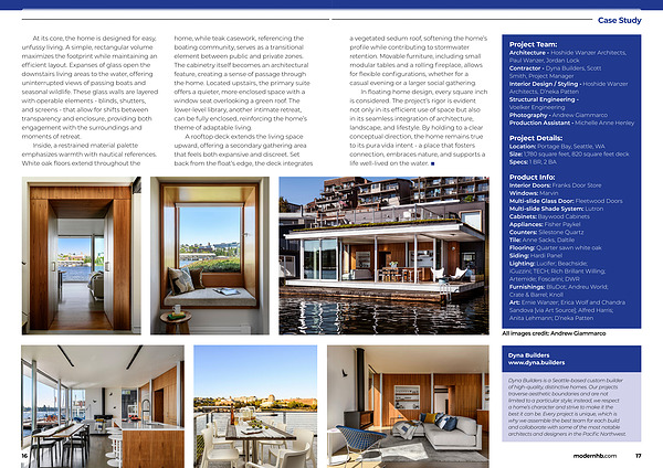 home, while teak casework, referencing the boating community, serves as a transitional element between public and private zones. The cabinetry itself becomes an architectural feature, creating a sense of passage through the home. Located upstairs, the primary suite offers a quieter, more enclosed space with a window seat overlooking a green roof. The lower-level library, another intimate retreat, can be fully enclosed, reinforcing the home’ s theme of adaptable living.