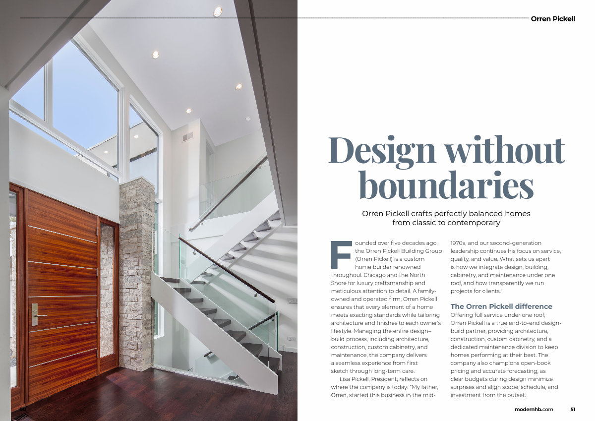 Founded over five decades ago, the Orren Pickell Building Group( Orren Pickell) is a custom home builder renowned throughout Chicago and the North Shore for luxury craftsmanship and meticulous attention to detail. A familyowned and operated firm, Orren Pickell ensures that every element of a home meets exacting standards while tailoring architecture and finishes to each owner’ s lifestyle. Managing the entire design – build process, including architecture, construction, custom cabinetry, and maintenance, the company delivers a seamless experience from first sketch through long-term care.