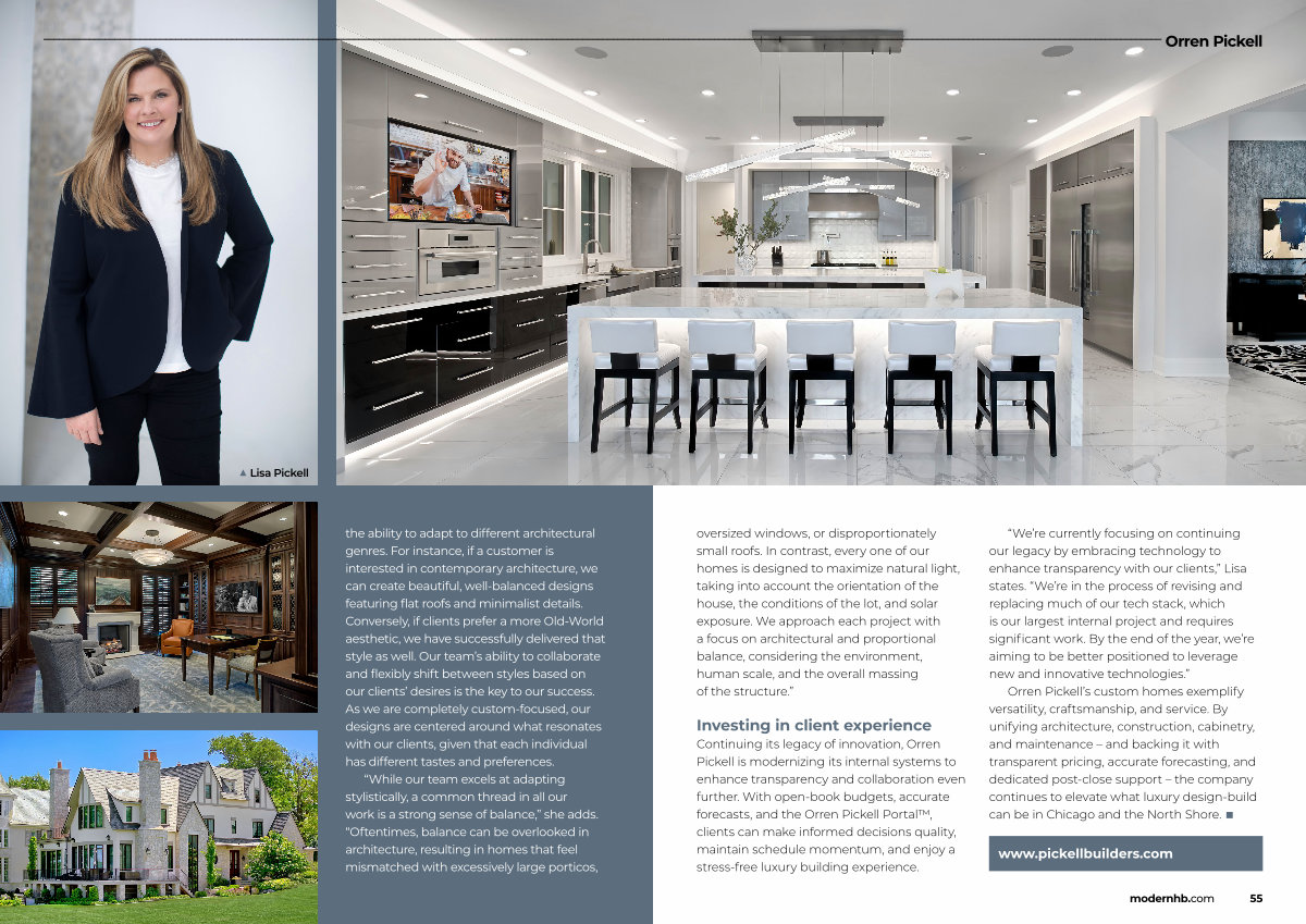 ▲ Lisa Pickell the ability to adapt to different architectural genres. For instance, if a customer is interested in contemporary architecture, we can create beautiful, well-balanced designs featuring flat roofs and minimalist details. Conversely, if clients prefer a more Old-World aesthetic, we have successfully delivered that style as well. Our team’ s ability to collaborate and flexibly shift between styles based on our clients’ desires is the key to our success. As we are completely custom-focused, our designs are centered around what resonates with our clients, given that each individual has different tastes and preferences.