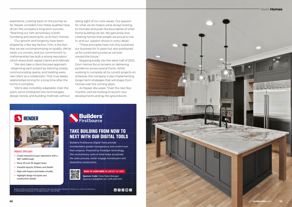 experience. Looking back on the journey so far, Nasser considers how these qualities have driven the company’ s long-term success:“ Reaching our 14th anniversary is both humbling and exciting for us at Dorri Homes.“ Our growth and longevity have been shaped by a few key factors. First, is the fact that we are uncompromising on quality. We’ ve never cut corners, and our commitment to craftsmanship has built a strong reputation which draws both repeat clients and referrals.