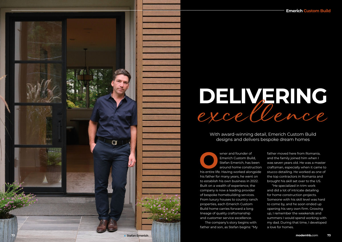 The company’ s story begins with father and son, as Stefan begins:“ My father moved here from Romania, and the family joined him when I was seven years old. He was a master craftsman, especially when it came to stucco detailing. He worked as one of the top contractors in Romania and brought his skill set over to the US.“ He specialized in trim work and did a lot of intricate detailing for home construction projects. Someone with his skill level was hard to come by, and he soon ended up opening his very own firm. Growing up, I remember the weekends and summers I would spend working with my dad. During that time, I developed a love for homes. modernhb. com 73