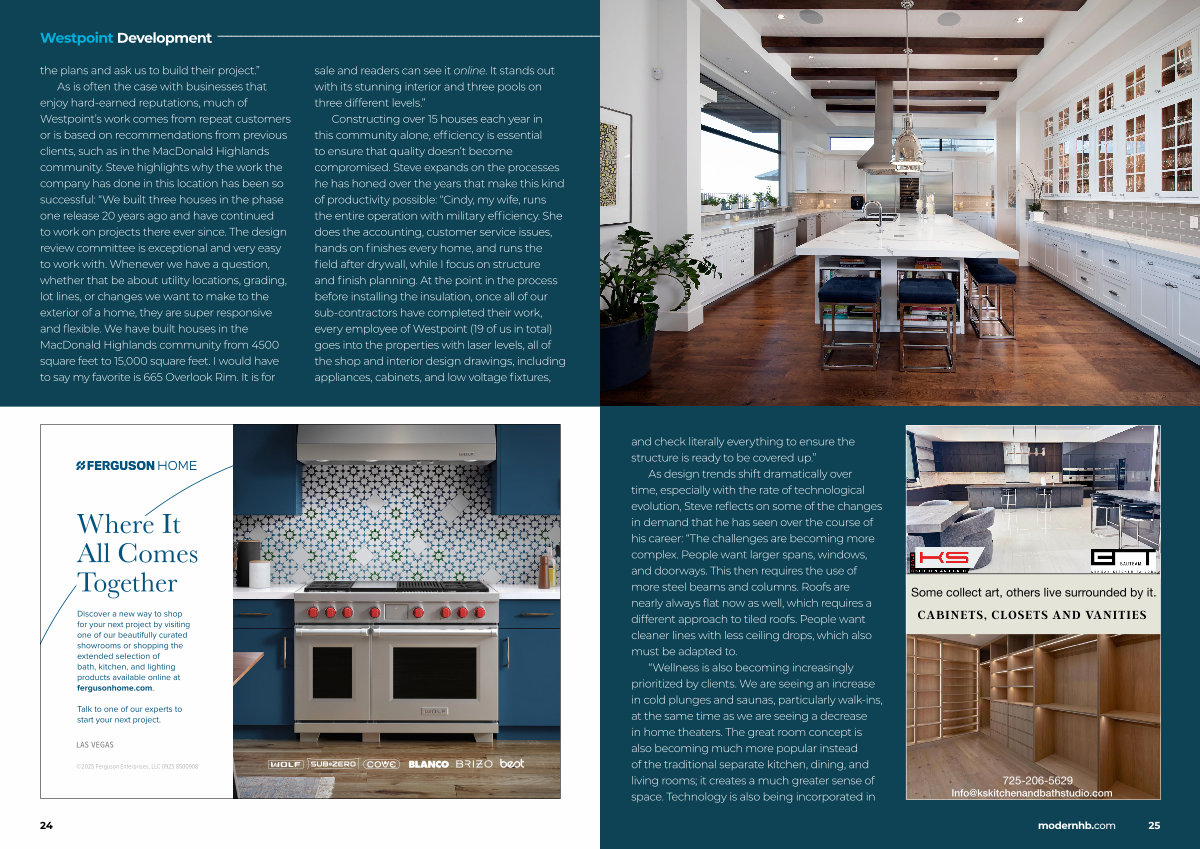 As is often the case with businesses that enjoy hard-earned reputations, much of Westpoint’ s work comes from repeat customers or is based on recommendations from previous clients, such as in the MacDonald Highlands community. Steve highlights why the work the company has done in this location has been so successful:“ We built three houses in the phase one release 20 years ago and have continued to work on projects there ever since. The design review committee is exceptional and very easy to work with. Whenever we have a question, whether that be about utility locations, grading, lot lines, or changes we want to make to the exterior of a home, they are super responsive and flexible. We have built houses in the MacDonald Highlands community from 4500 square feet to 15,000 square feet. I would have to say my favorite is 665 Overlook Rim. It is for sale and readers can see it online. It stands out with its stunning interior and three pools on three different levels.”
