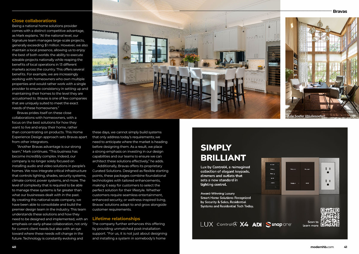 “ Another Bravas advantage is our strong team,” Mark continues.“ This business has become incredibly complex. Indeed, our company is no longer solely focused on installing audio and video solutions in people’ s homes. We now integrate critical infrastructure that controls lighting, shades, security systems, climate control, power systems, and more. The level of complexity that is required to be able to manage these systems is far greater than what our businesses dealt with in the past. By creating this national-scale company, we have been able to consolidate and build the premier design team in the industry. This team understands these solutions and how they need to be designed and implemented, with an emphasis on early-phase collaboration, not only for current client needs but also with an eye toward where these needs will change in the future. Technology is constantly evolving and