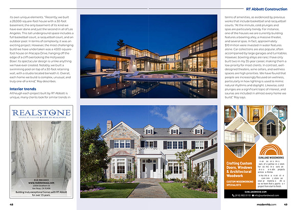 terms of amenities, as evidenced by previous works that include basketball and racquetball courts.“ At the minute, cold plunges and spas are particularly trendy. For instance, one of the houses we are currently building features a bowling alley, a massive theater, and several spas. In fact, approximately $ 10 million were invested in water features alone. Car collections are also popular, often accompanied by large garages and turntables. However, bowling alleys are rare; I have only built two in my 35-year career, making them a low priority for most clients. In contrast, welldesigned theaters, wine cellars, and wellness spaces are high priorities. We have found that people are increasingly focused on wellness, particularly in how lighting is used to mimic natural rhythms and daylight. Likewise, cold plunges are a significant topic of interest, and saunas are included in almost every home we build,” Roy says.