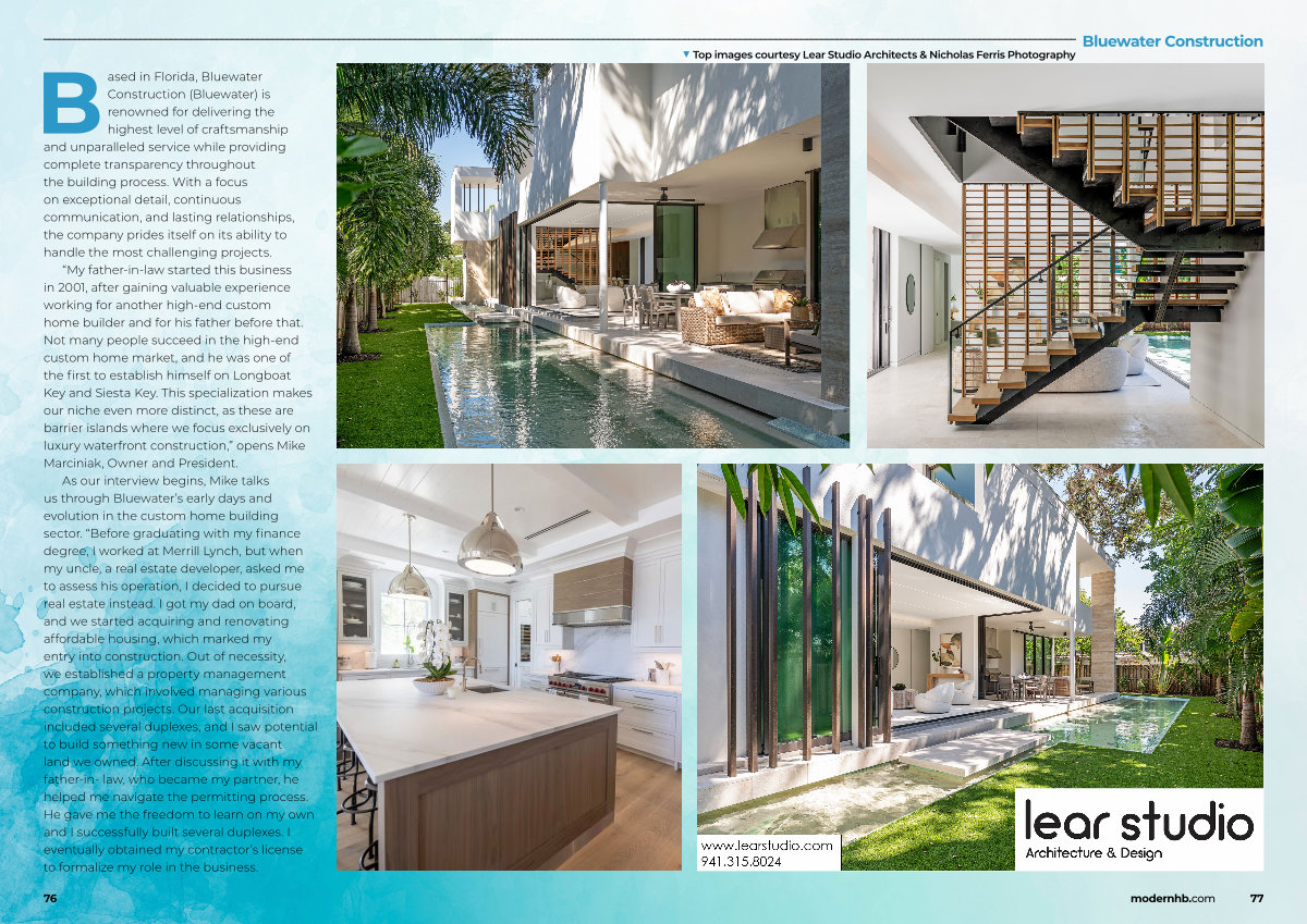 Based in Florida, Bluewater Construction( Bluewater) is renowned for delivering the highest level of craftsmanship and unparalleled service while providing complete transparency throughout the building process. With a focus on exceptional detail, continuous communication, and lasting relationships, the company prides itself on its ability to handle the most challenging projects.