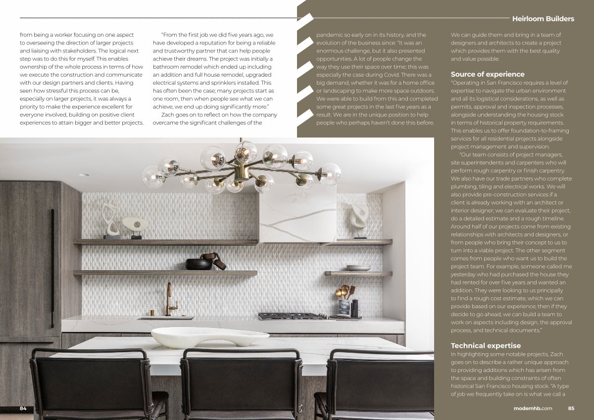 from being a worker focusing on one aspect to overseeing the direction of larger projects and liaising with stakeholders. The logical next step was to do this for myself. This enables ownership of the whole process in terms of how we execute the construction and communicate with our design partners and clients. Having seen how stressful this process can be, especially on larger projects, it was always a priority to make the experience excellent for everyone involved, building on positive client experiences to attain bigger and better projects.
