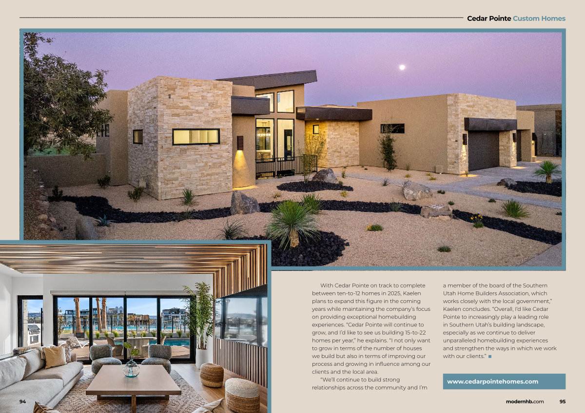 “ We’ ll continue to build strong relationships across the community and I’ m a member of the board of the Southern Utah Home Builders Association, which works closely with the local government,” Kaelen concludes.“ Overall, I’ d like Cedar Pointe to increasingly play a leading role in Southern Utah’ s building landscape, especially as we continue to deliver unparalleled homebuilding experiences and strengthen the ways in which we work with our clients.” ■