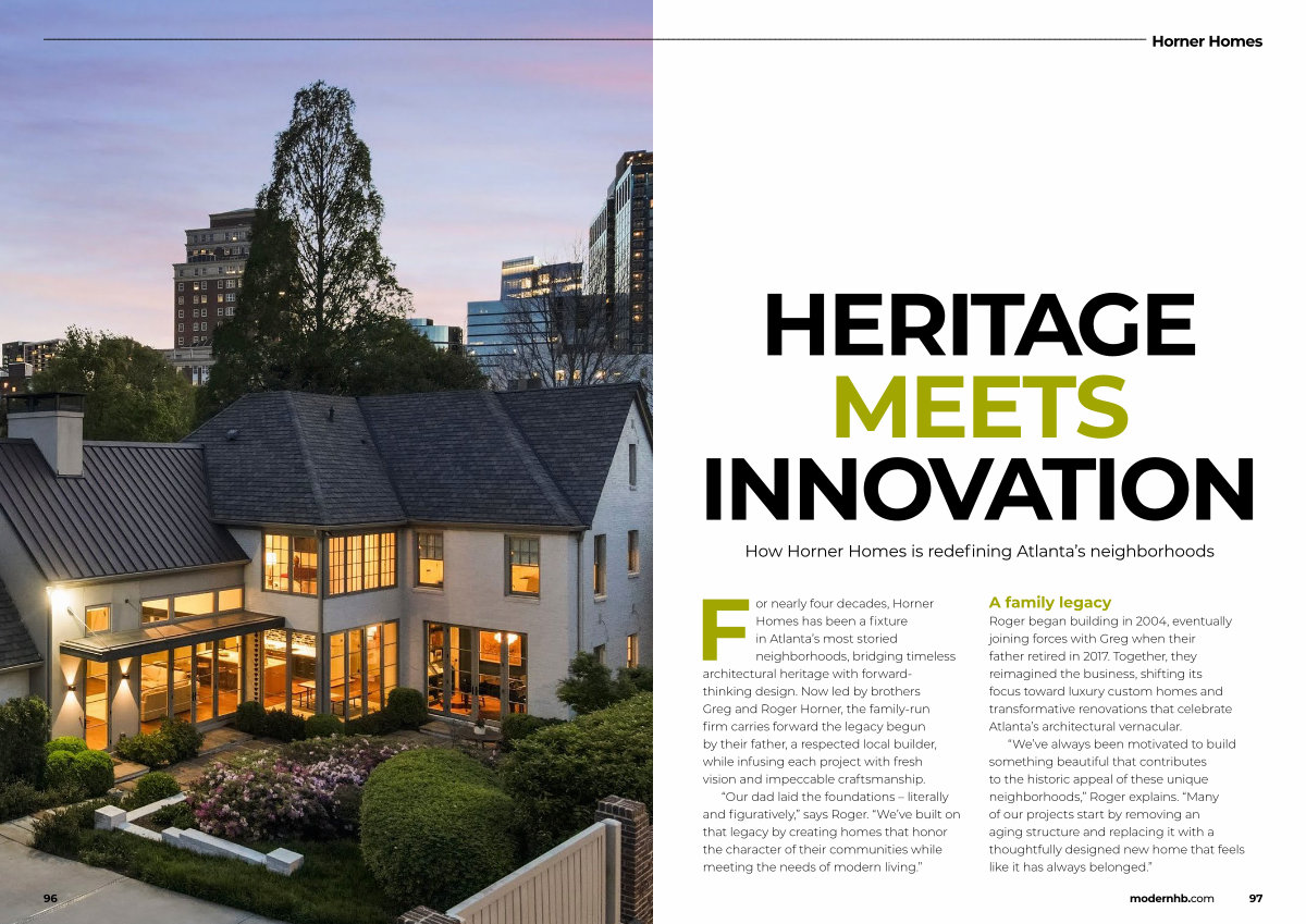 For nearly four decades, Horner Homes has been a fixture in Atlanta’ s most storied neighborhoods, bridging timeless architectural heritage with forwardthinking design. Now led by brothers Greg and Roger Horner, the family-run firm carries forward the legacy begun by their father, a respected local builder, while infusing each project with fresh vision and impeccable craftsmanship.