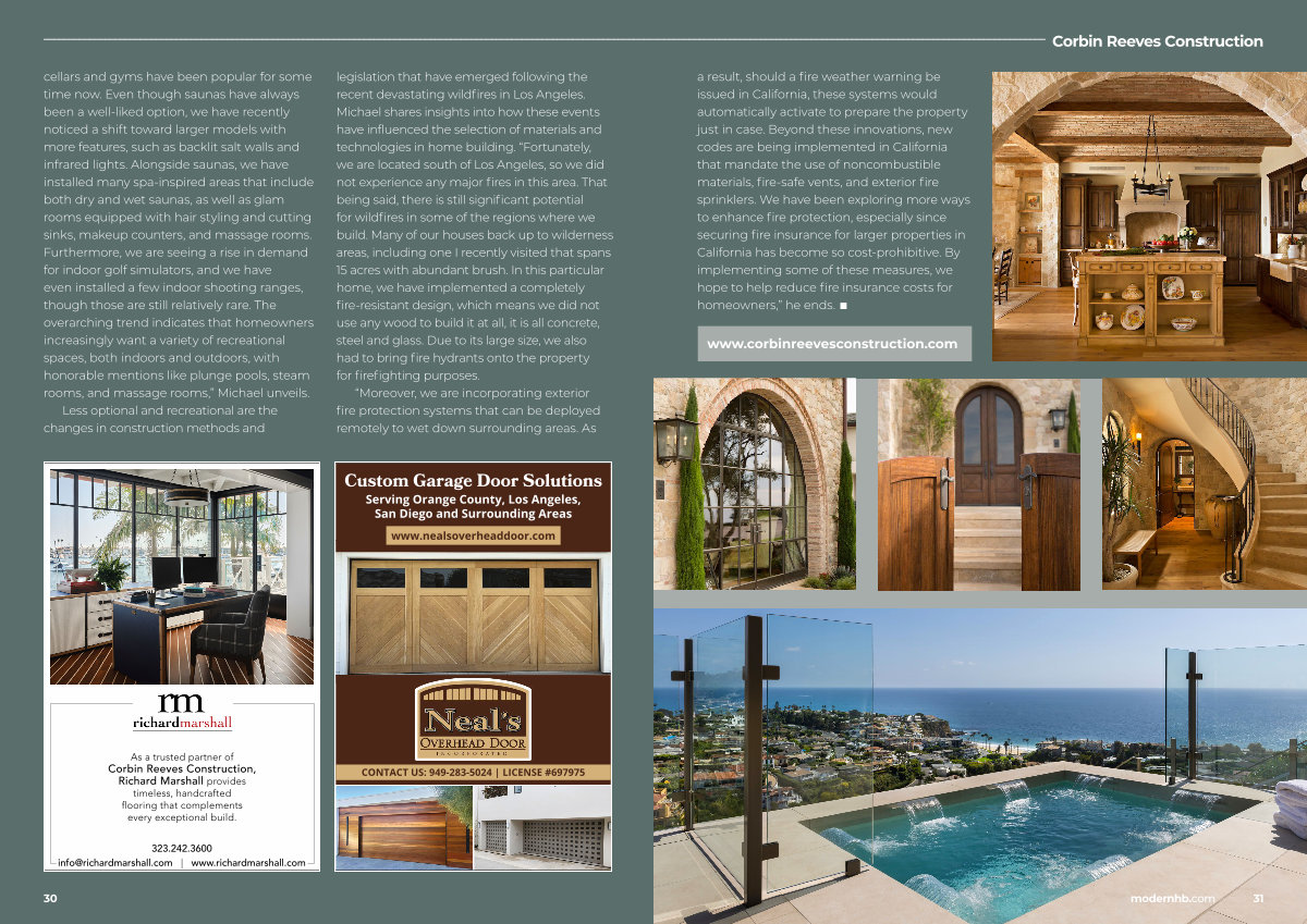 legislation that have emerged following the recent devastating wildfires in Los Angeles. Michael shares insights into how these events have influenced the selection of materials and technologies in home building.“ Fortunately, we are located south of Los Angeles, so we did not experience any major fires in this area. That being said, there is still significant potential for wildfires in some of the regions where we build. Many of our houses back up to wilderness areas, including one I recently visited that spans 15 acres with abundant brush. In this particular home, we have implemented a completely fire-resistant design, which means we did not use any wood to build it at all, it is all concrete, steel and glass. Due to its large size, we also had to bring fire hydrants onto the property for firefighting purposes.