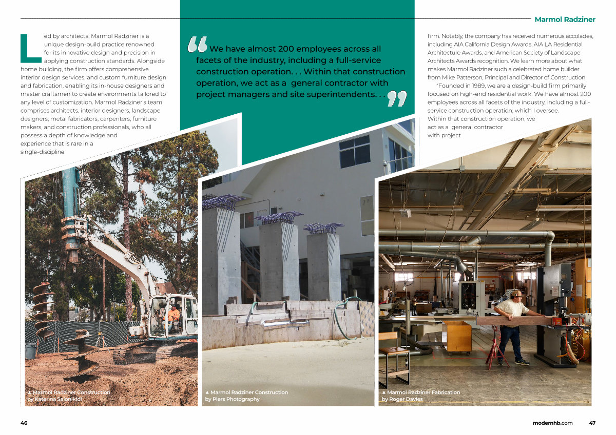 Radziner ployees across all ing a full-service ithin that construction ral contractor with uperintendents... firm. Notably, the company has received numerous accolades, including AIA California Design Awards, AIA LA Residential Architecture Awards, and American Society of Landscape Architects Awards recognition. We learn more about what makes Marmol Radziner such a celebrated home builder from Mike Patterson, Principal and Director of Construction.