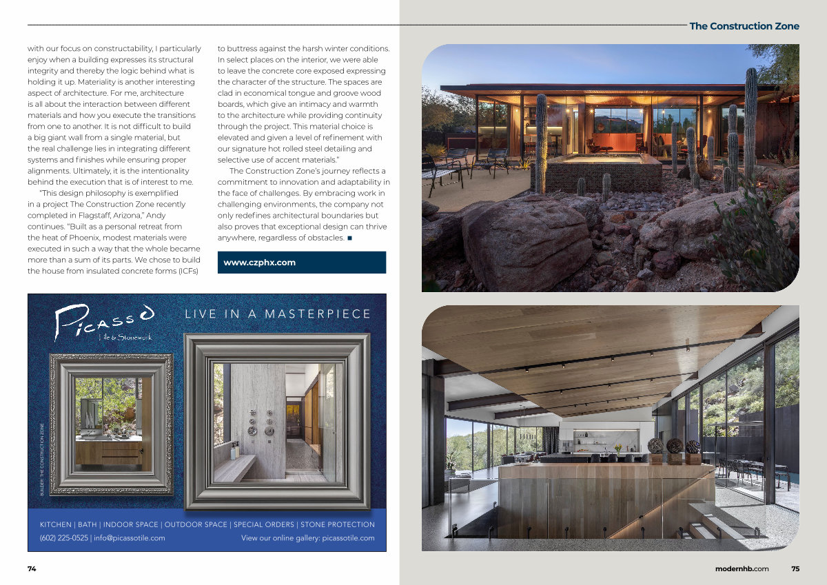 with our focus on constructability, I particularly enjoy when a building expresses its structural integrity and thereby the logic behind what is holding it up. Materiality is another interesting aspect of architecture. For me, architecture is all about the interaction between different materials and how you execute the transitions from one to another. It is not difficult to build a big giant wall from a single material, but the real challenge lies in integrating different systems and finishes while ensuring proper alignments. Ultimately, it is the intentionality behind the execution that is of interest to me.“ This design philosophy is exemplified in a project The Construction Zone recently completed in Flagstaff, Arizona,” Andy continues.“ Built as a personal retreat from the heat of Phoenix, modest materials were executed in such a way that the whole became more than a sum of its parts. We chose to build the house from insulated concrete forms( ICFs)