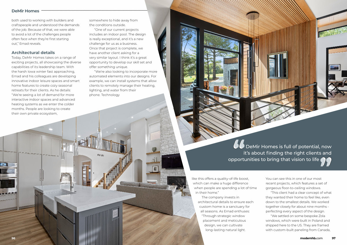 Today, DeMir Homes takes on a range of exciting projects, all showcasing the diverse capabilities of its leadership team. With the harsh Iowa winter fast approaching, Ernad and his colleagues are developing innovative indoor leisure spaces and smart home features to create cozy seasonal retreats for their clients. As he details:“ We’ re seeing a lot of demand for more interactive indoor spaces and advanced heating systems as we enter the colder months. People are looking to create their own private ecosystem,