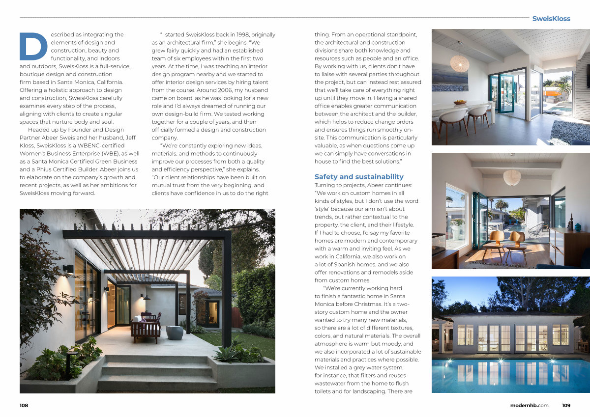 “ We’ re currently working hard to finish a fantastic home in Santa Monica before Christmas. It’ s a twostory custom home and the owner wanted to try many new materials, so there are a lot of different textures, colors, and natural materials. The overall atmosphere is warm but moody, and we also incorporated a lot of sustainable materials and practices where possible. We installed a grey water system, for instance, that filters and reuses wastewater from the home to flush toilets and for landscaping. There are modernhb. com 109