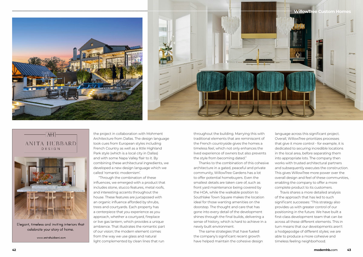 The same strategies that have fueled the company’ s significant recent growth have helped maintain the cohesive design language across this significant project. Overall, WillowTree prioritizes processes that give it more control- for example, it is dedicated to securing incredible locations in the local area, before separating them into appropriate lots. The company then works with trusted architectural partners and subsequently executes the construction. This gives WillowTree more power over the overall design and feel of these communities, enabling the company to offer a more complete product to its customers.