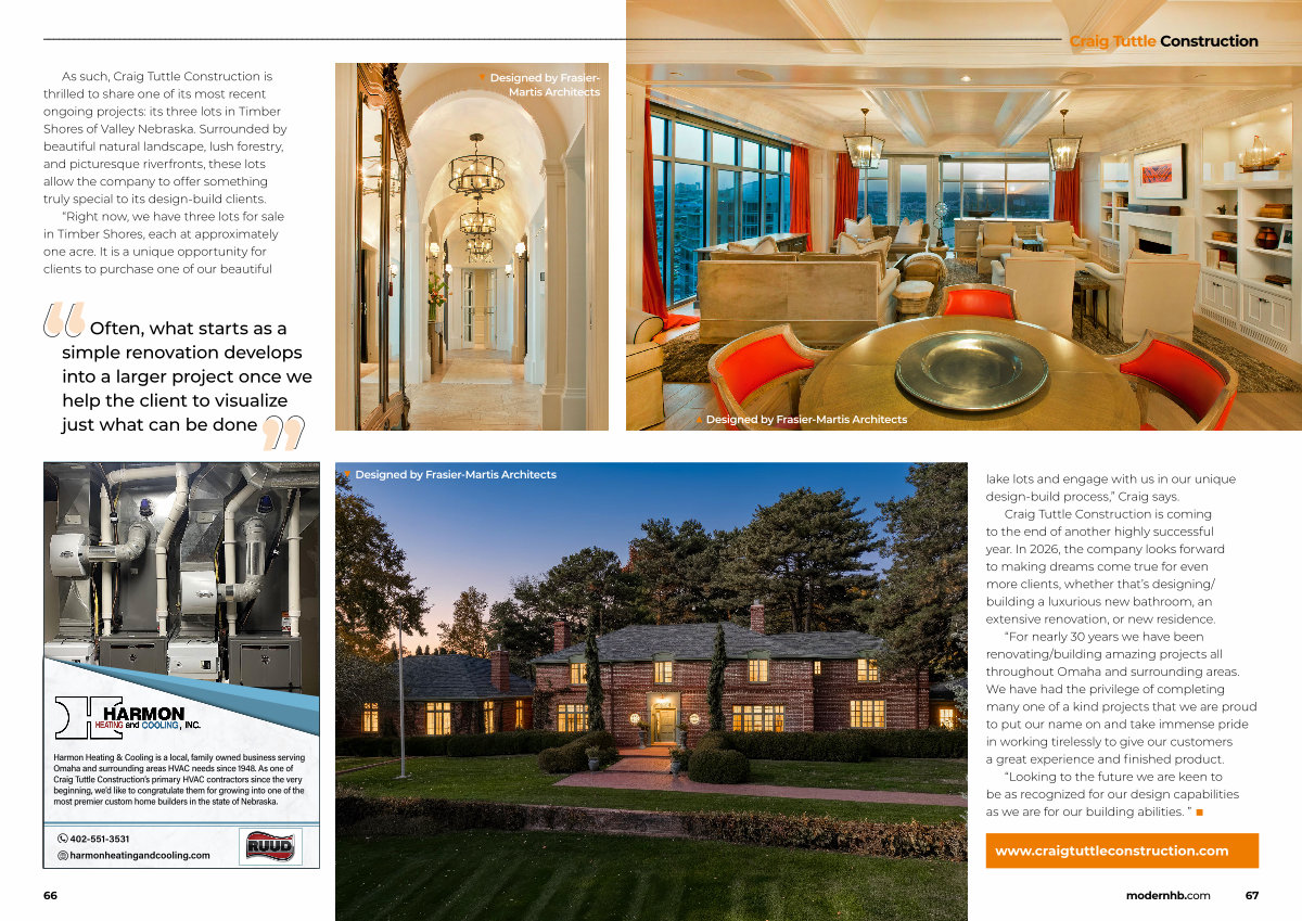 Craig Tuttle Construction is coming to the end of another highly successful year. In 2026, the company looks forward to making dreams come true for even more clients, whether that’ s designing / building a luxurious new bathroom, an extensive renovation, or new residence.“ For nearly 30 years we have been renovating / building amazing projects all throughout Omaha and surrounding areas. We have had the privilege of completing many one of a kind projects that we are proud to put our name on and take immense pride in working tirelessly to give our customers a great experience and finished product.
