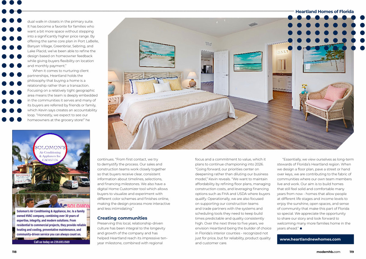 focus and a commitment to value, which it plans to continue championing into 2026.“ Going forward, our priorities center on deepening rather than diluting our business model,” Kevin reveals.“ We want to maintain affordability by refining floor plans, managing construction costs, and leveraging financing options such as FHA and USDA where buyers qualify. Operationally, we are also focused on supporting our construction teams and trade partners with the systems and scheduling tools they need to keep build times predictable and quality consistently high. Over the next three to five years, we envision Heartland being the builder of choice in Florida’ s interior counties- recognized not just for price, but for reliability, product quality and customer care.