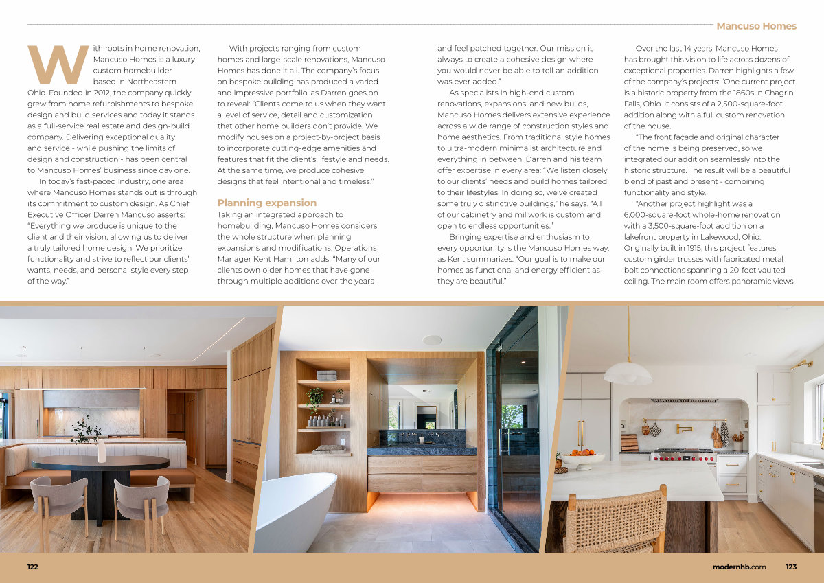 With roots in home renovation, Mancuso Homes is a luxury custom homebuilder based in Northeastern Ohio. Founded in 2012, the company quickly grew from home refurbishments to bespoke design and build services and today it stands as a full-service real estate and design-build company. Delivering exceptional quality and service- while pushing the limits of design and construction- has been central to Mancuso Homes’ business since day one. In today’ s fast-paced industry, one area where Mancuso Homes stands out is through its commitment to custom design. As Chief Executive Officer Darren Mancuso asserts:“ Everything we produce is unique to the client and their vision, allowing us to deliver a truly tailored home design. We prioritize functionality and strive to reflect our clients’ wants, needs, and personal style every step of the way.”