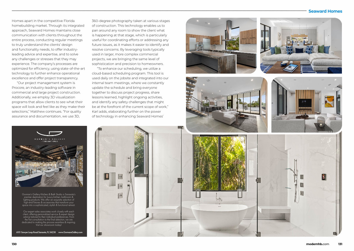 360-degree photography taken at various stages of construction. This technology enables us to pan around any room to show the client what is happening at that stage, which is particularly useful for coordinating efforts or addressing any future issues, as it makes it easier to identify and resolve concerns. By leveraging tools typically used in larger, more complex commercial projects, we are bringing the same level of sophistication and precision to homeowners.“ To enhance our scheduling, we utilize a cloud-based scheduling program. This tool is used daily on the jobsite and integrated into our internal team meetings, where we constantly update the schedule and bring everyone together to discuss project progress, share lessons learned, highlight ongoing activities, and identify any safety challenges that might be at the forefront of the current scope of work,” Karl adds, elaborating further on the power of technology in enhancing Seaward Homes’
